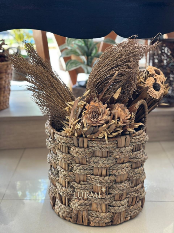 Canasto de bambú con junco, con asas. 35cm de alto aprox.