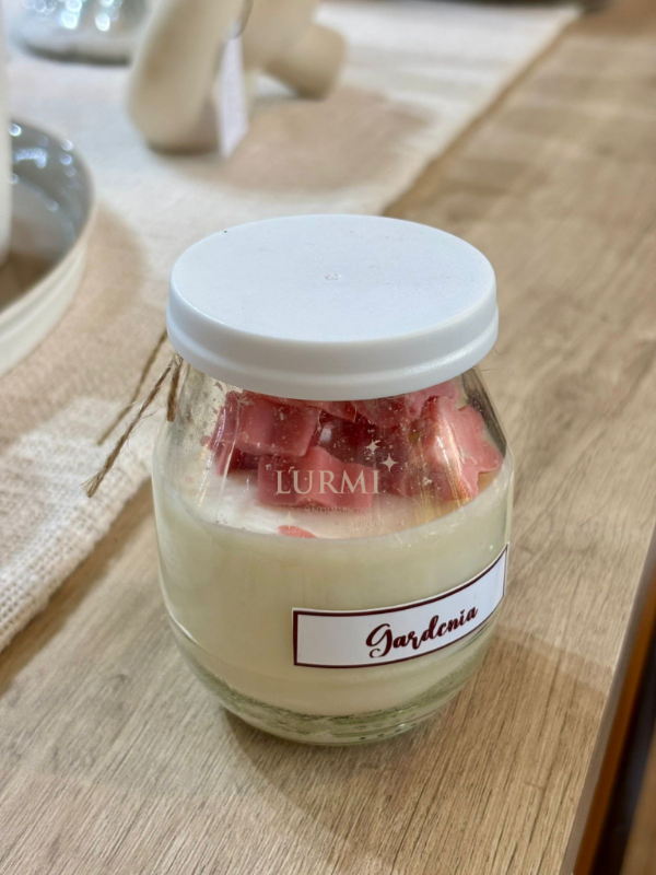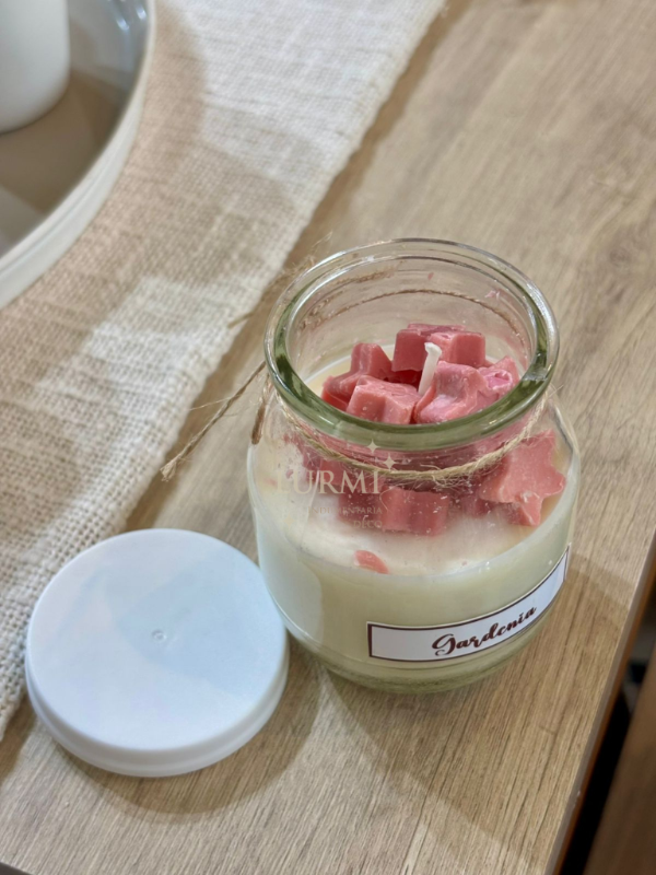 Vela aromática en frasco de vidrio y tapa blanca de plástico, con mini estrellitas rosas dentro. Aroma: Gardenia. 8x6cm.