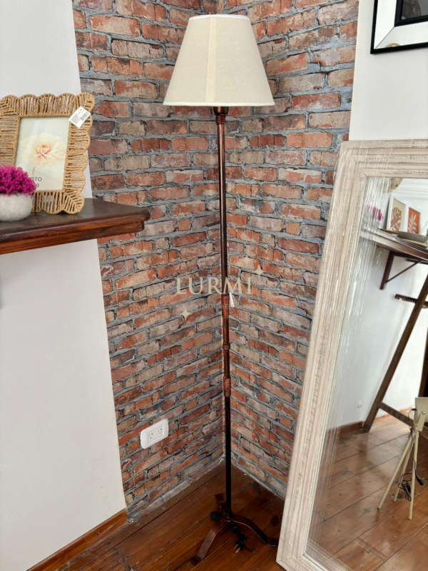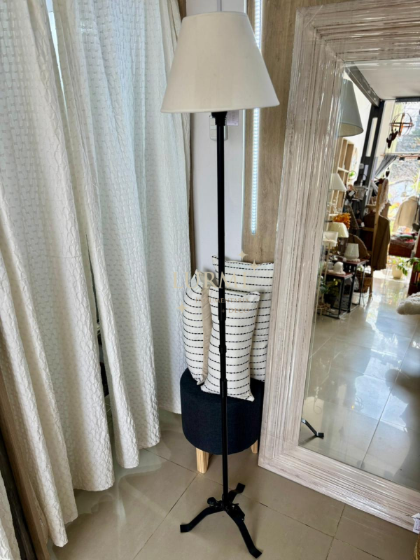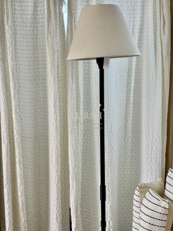 Lámpara de pie de metal con argollas y pantalla cono lisa en color blanco. Disponible en color negro y/o cobre. 1,70mts de alto aprox.