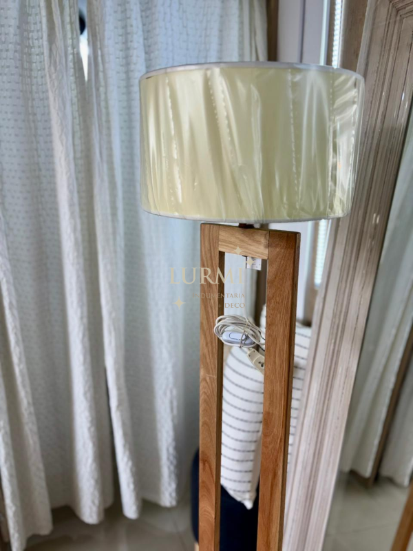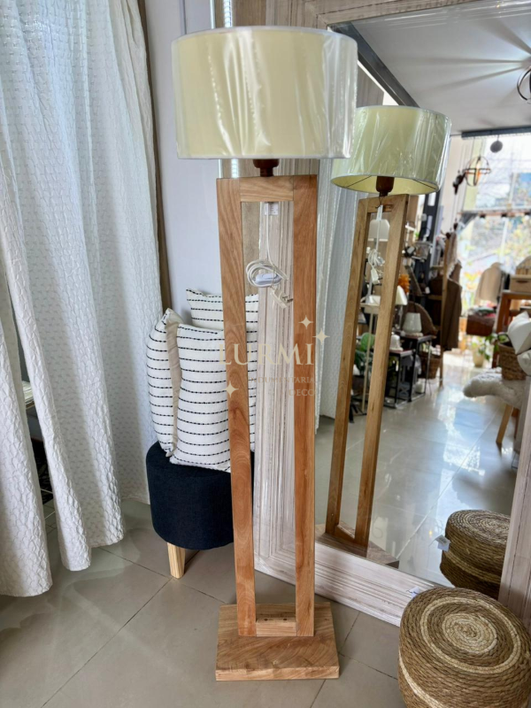 Lámpara de pie estilo nórdico de madera eucalipto y pantalla circular lisa en color natural. 1,50mts de alto.