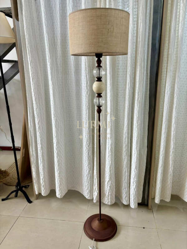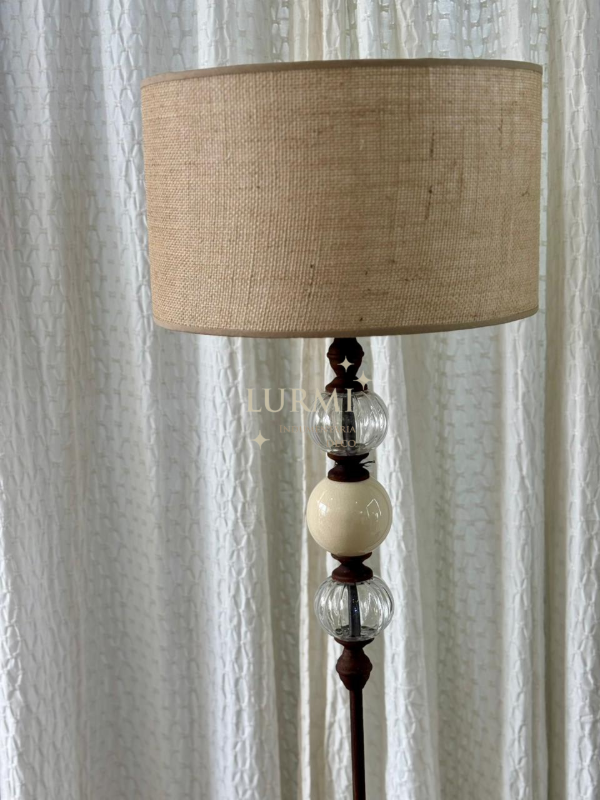Lámpara de pie de óxido con dos esferas de vidrio y una esfera de cerámica en color natural. Pantalla circular arpillera en color camel. 1,55mts de alto aprox.